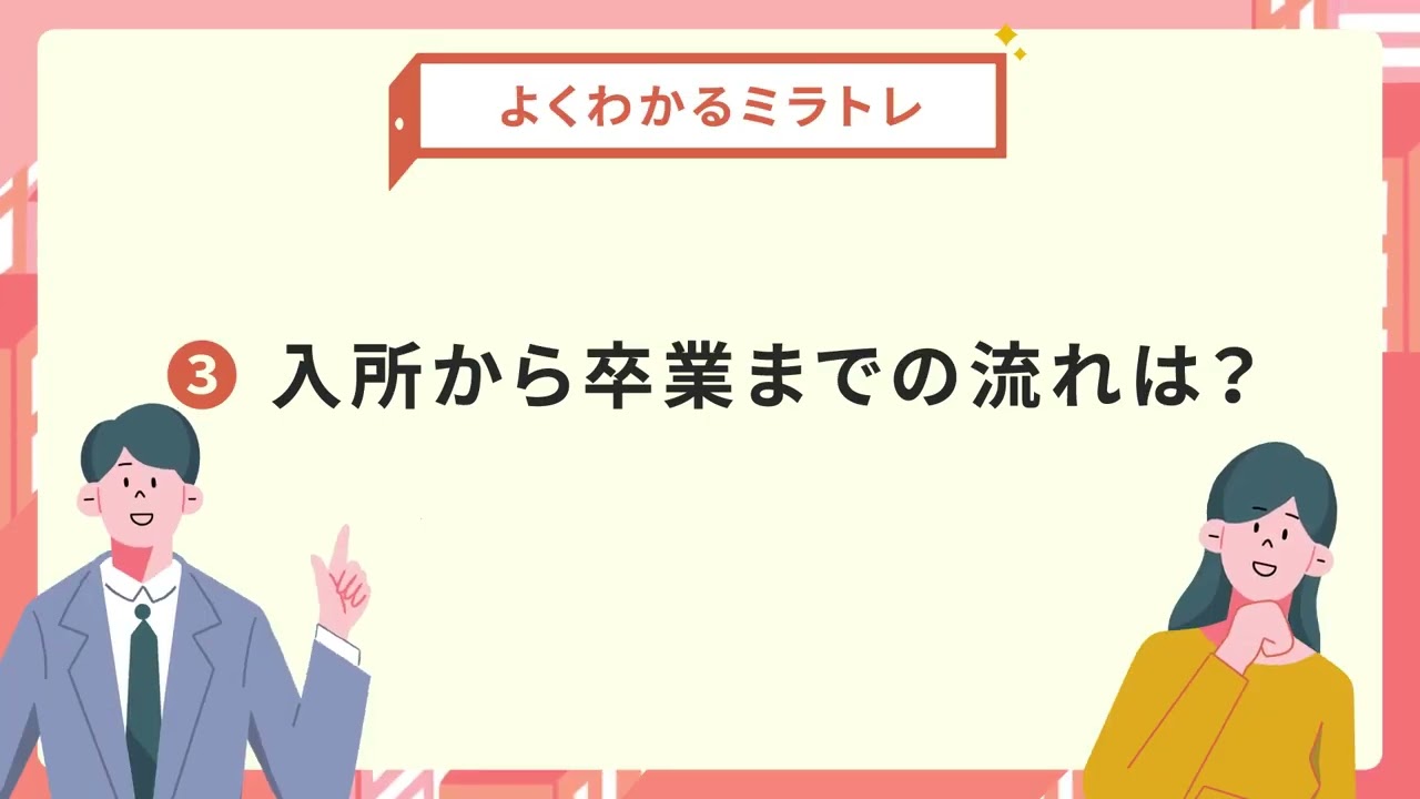 就労移行支援についてや、ミラトレのサービスの特徴と入所から卒業までの流れを動画でわかりやすく解説します