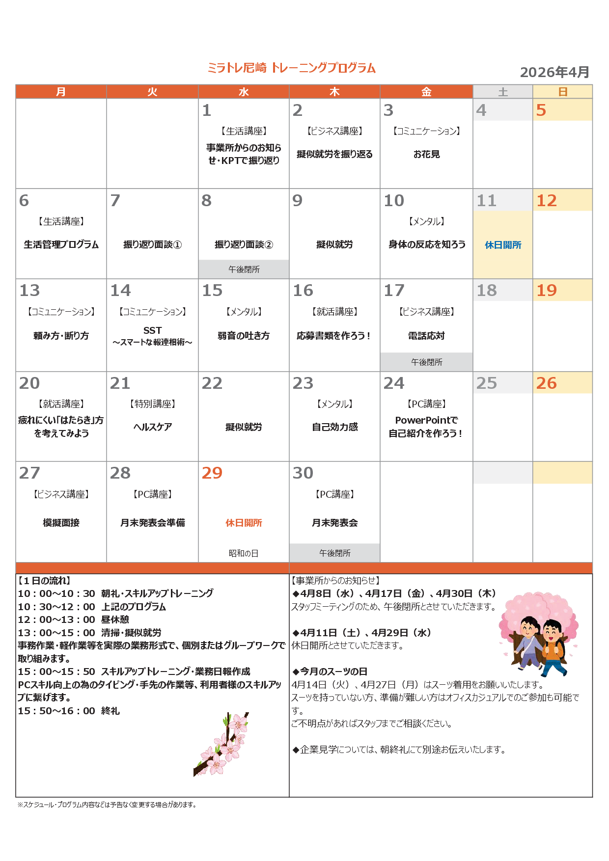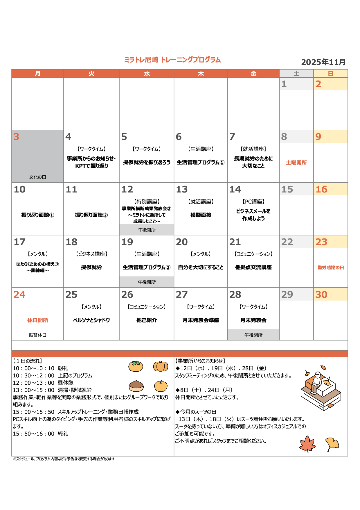 ミラトレ尼崎では就職はゴールではなくスタートであると考えており、就職した後も長く安心して働くことを目指すためのプログラムの提供をしています。