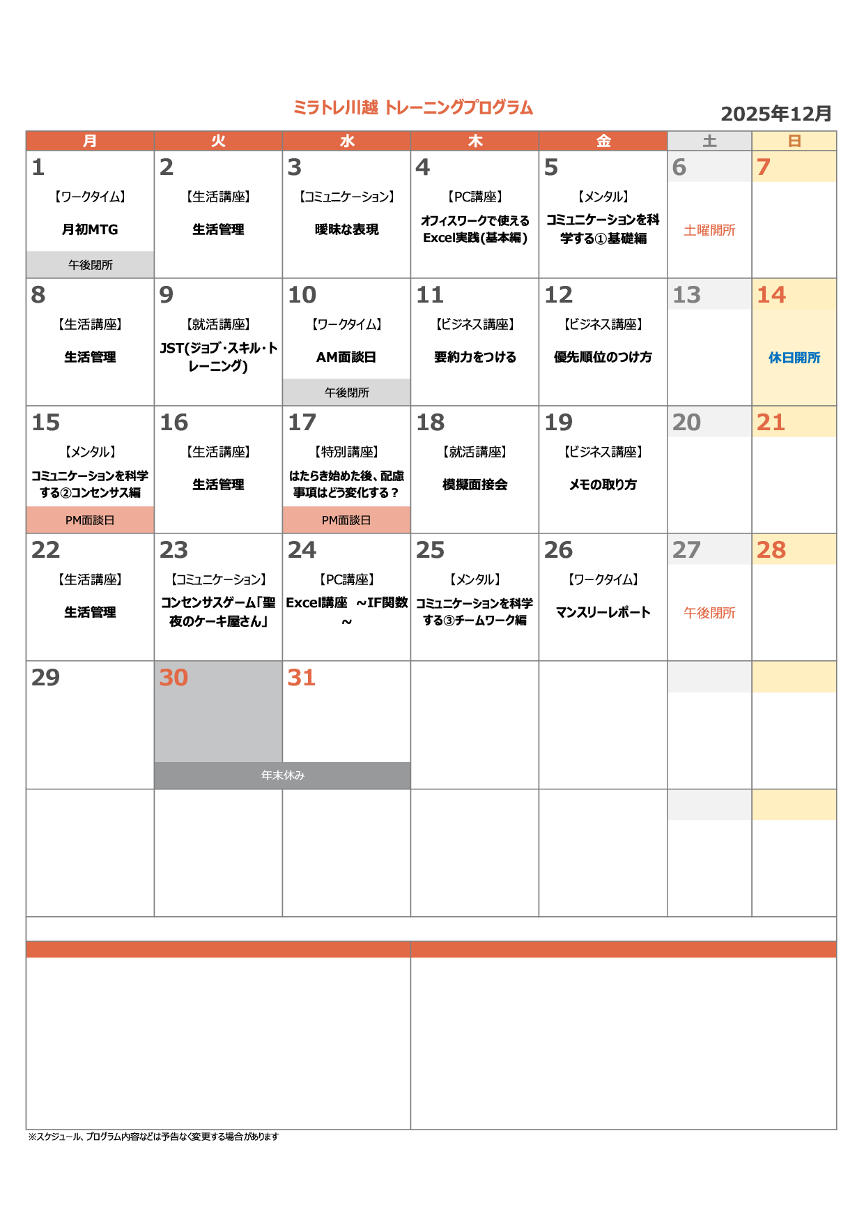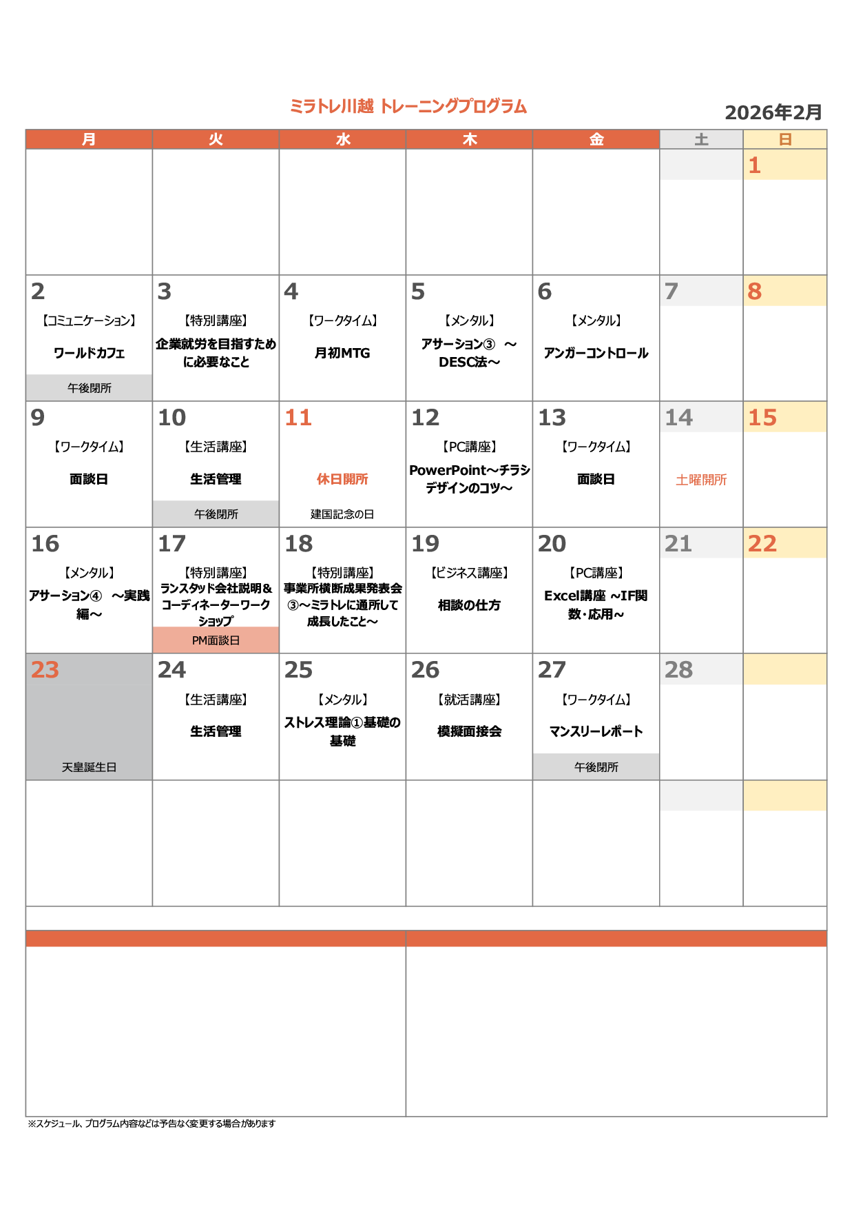 皆さんの理想の就職に向けて、就職活動のサポートだけでなく、長期就労に繋がるよう生活面や体調面についてもご支援しております。また、ミラトレ川越では安心して就職活動が進められるよう毎月面談の機会もあります。スタッフへ相談しやすいよう日々のコミュニケーションも大切にしておりますので、小さな困りごとでもお気軽にお問合せください。1つ1つスモールステップで一緒に取り組んでいきましょう!