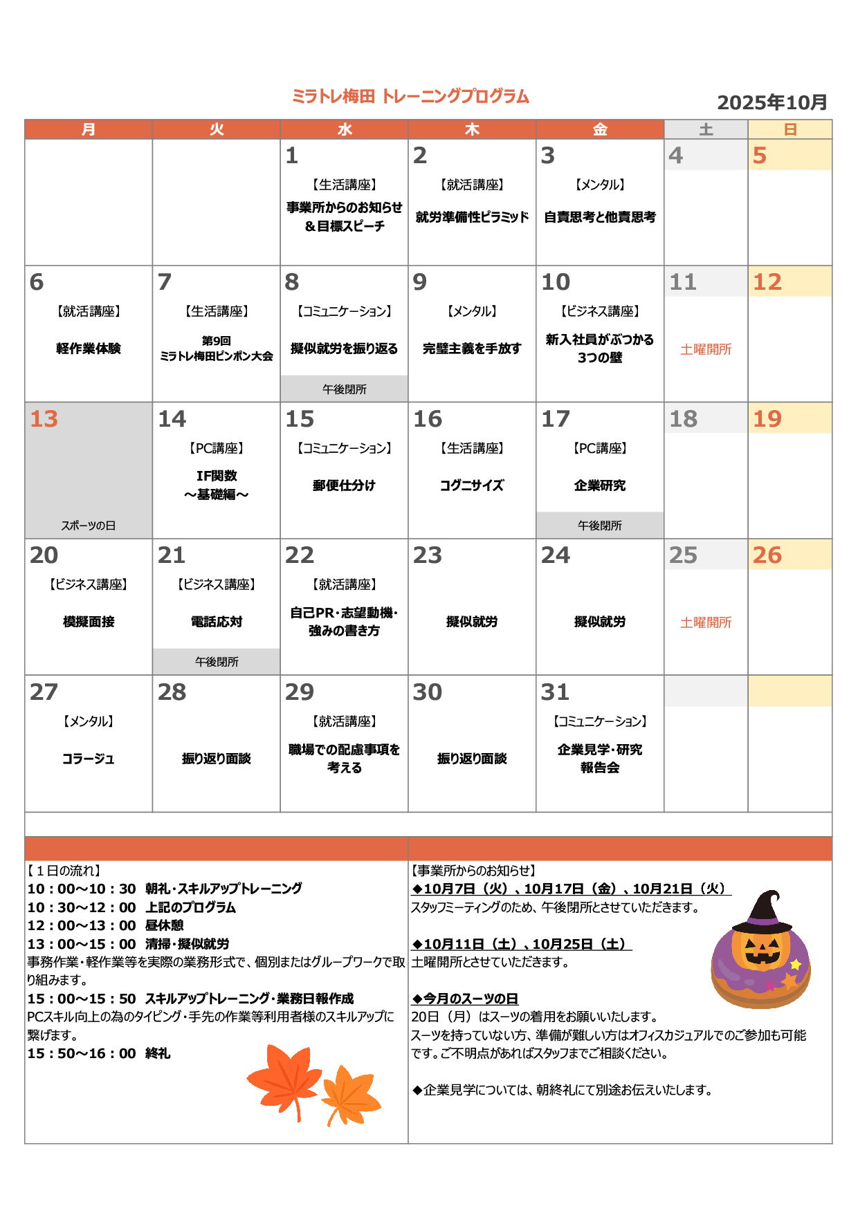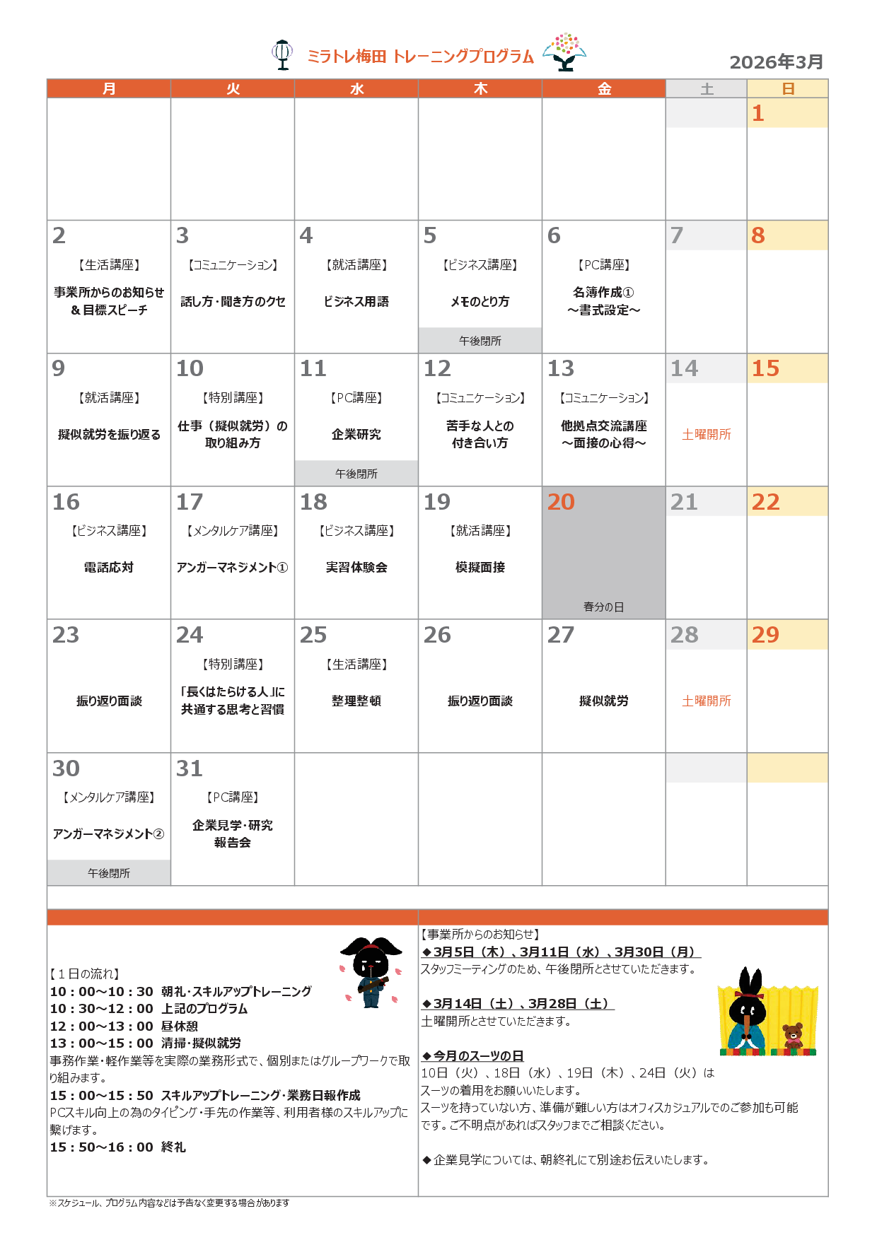 ミラトレ梅田では、「はたらく未来をあきらめない」をスローガンに、利用者様の長期就労に向けて日々取り組んでまいります。 また、事業所内で行うプログラムや擬似就労(ぎじしゅうろう:就労に向けた実践トレーニング)を通して、利用者様の就職への準備を高めていきます。 見学・体験・相談も受け付けております。お気軽にご連絡くださいませ。